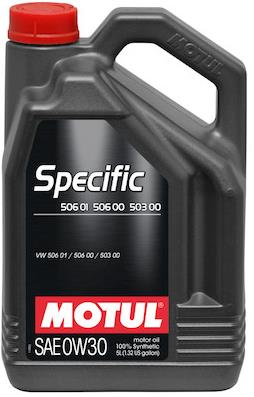MOTUL SPECIFIC VW 506.01 / 506.00 / 503.00 0W 30/0W30 (масло 0w30) - масло моторное по цене производителя (компании MOTUL). Энергосберегающее масло, позволяющее увеличить временные интервалы для замены моторного масла новых дизельных и бензиновых двигателей (фирмы AUDI, SEAT, VW), начиная с 2000 года. 100% синтетика, произведенная по технологии сложных эфиров. Отличные антикоррозийные и смазывающие характеристики, защита от механического износа двигателя, высокое температурное сопротивление. Для турбо двигателей с комплексом насос-форсунка, работающих на дизельном топливе, (компании VW, Scoda,Audi, Seat), с фиксированным временным интервалом замены масла через 15 000 км, производитель Мотуль рекомендует использовать масло Motul Specific 505.01-505.00-502.00 5W40/5W 40 Для двигателей Audi мощностью 225 и 210 л.с. (TT и S3), работающих на бензине, а также W-образных двигателей, производитель Мотуль рекомендует использовать моторное масло MOTUL SPECIFIC 504.00-507.00 5W 30/5W30.