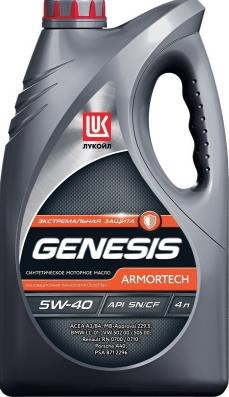 ЛУКОЙЛ GENESIS ARMORTECH 5W-40 – всесезонное полностью синтетическое моторное масло последнего поколения для применения во всех современных высокофорсированных двигателях легковых, лёгких грузовых, спортивных автомобилей и микроавтобусов, в том числе оборудованных турбонаддувом. ЛУКОЙЛ GENESIS ARMORTECH 5W-40 – производится с использованием высококачественных синтетических компонентов с применением передовой технологии пакета присадок (DuraMax®), специально разработанного для ЛУКОЙЛ и обеспечивающего высокие противоизносные, антиокислительные и антикоррозионные свойства масла. Допуски: BMW LL-01, MB-Approval 229.5, VW 502.00/505.00, Renault RN 0700/0710, Porsche A40, FIAT 9.55535-N2, 9.55535-Z2, OPEL GM-LL-B-025, PSA B71 2296. Класс API: SN, Класс ACEA, A3/B4, A3/B3
