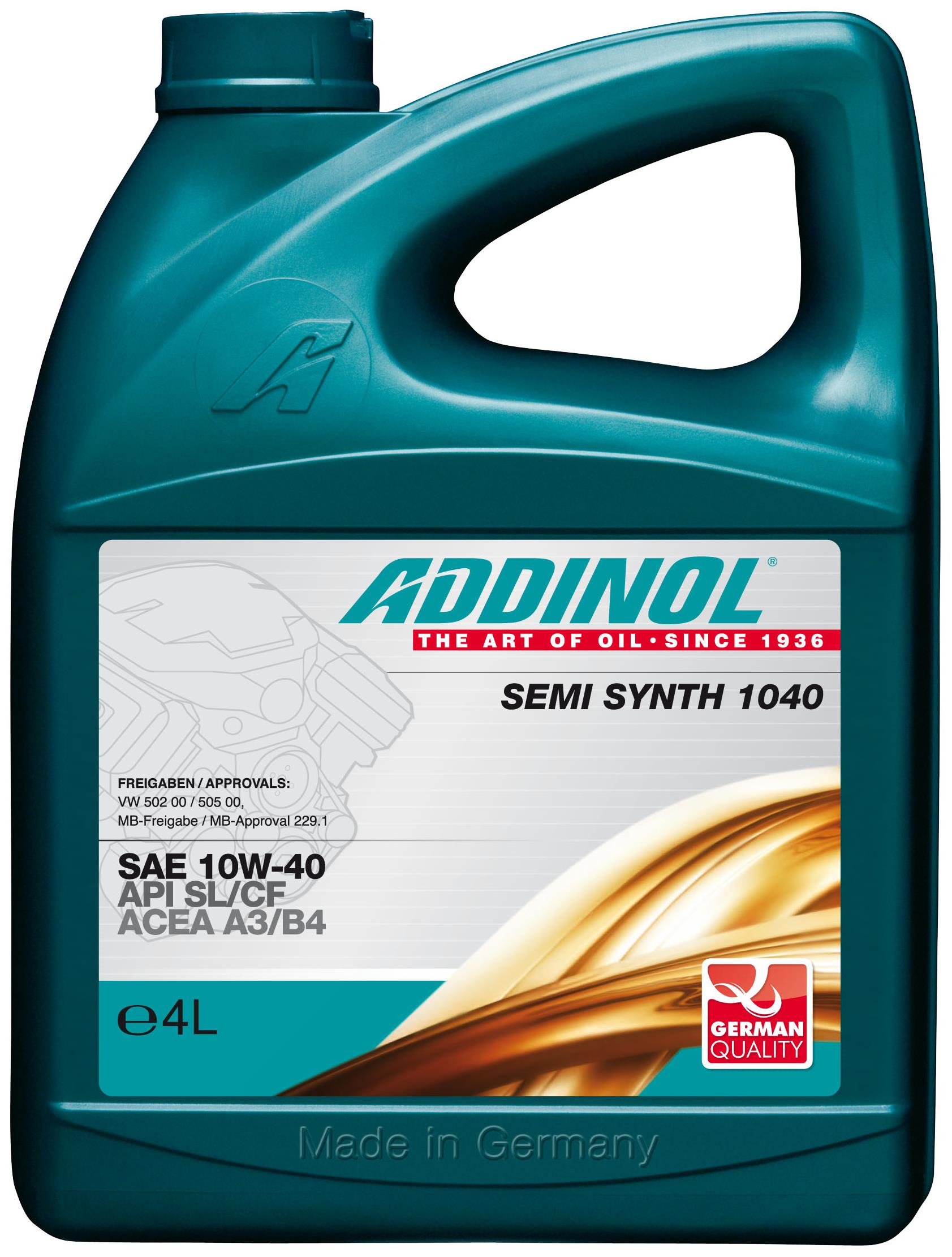 ADDINOL Semi Synth 1040 SAE 10W-40 - полусинтетическое моторное масло легкого хода для бензиновых и дизельных двигателей легковых автомобилей и микроавтобусов. Допуски: SAE 10W-40, ACEA A3/B4, API SL/CF; VW 502 00/505 00; MB 229.1; выполняет требования: BMW Longlife-98
