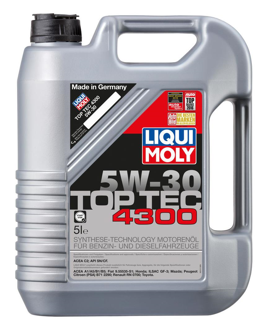 LM Top Tec 4300 5W30 - современное, малозольное моторное масло легкоходное моторное масло высшего класса для круглогодичного использования в бензиновых и дизельных двигателях. Представляет собой комбинацию НС-синтетических базовых масел и новейшего комплекса присадок, гарантирует отличную защиту от износа, сниженное потребление топлива и уменьшенный расход масла. Обеспечивает отличную прокачку по масляной системе двигателя. Особо рекомендуется для современных дизельных двигателей с многоступенчатым катализатором и сажевым фильтром (DPF). В зависимости от инструкции производителя возможно реализовать интервалы замены до 40.000 км. API SM/CF, ACEA A1-04/B1-04, A5-04/B5-04, C2-04, Honda, Toyota, Mazda Peugeot, Citroen (PSA) B71 2290, Fiat 9.55535 S1, ILSAC GF-3