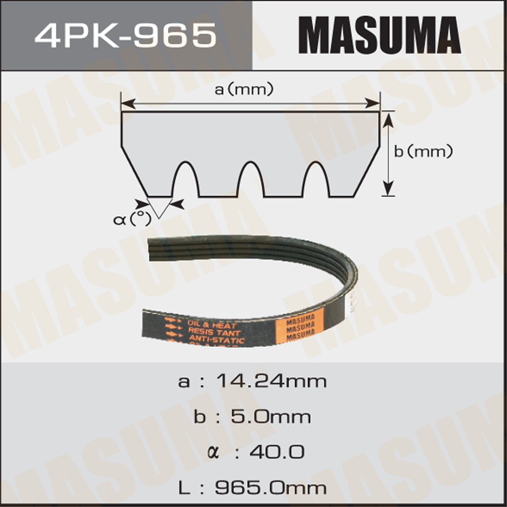 Описание: Автозапчасть фирмы MASUMA с кодом 4PK965 Ремень ручейковый Masuma 4PK- 965